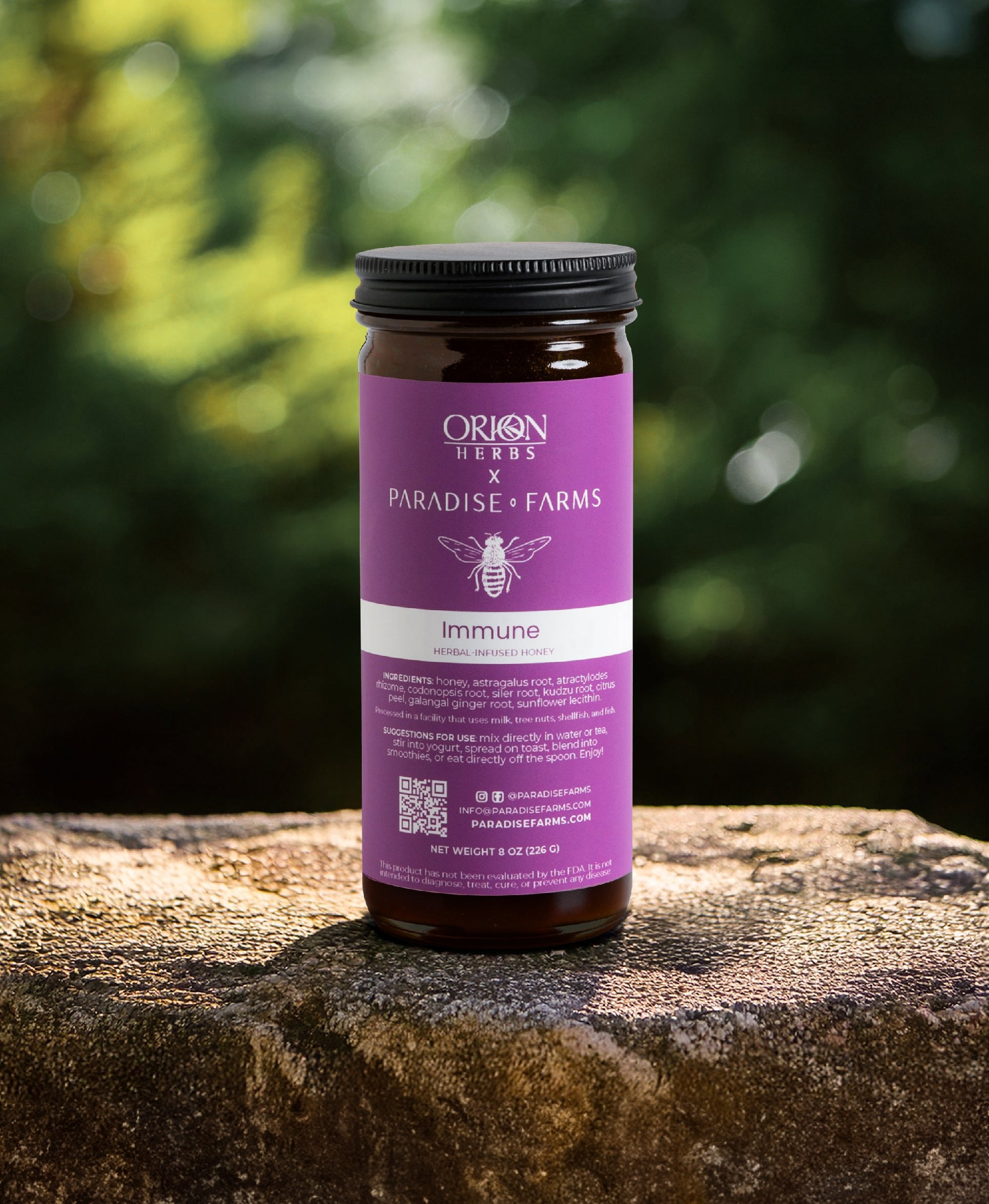 Honey that builds daily resilience with every spoonful. Our Immune Herbal-Infused Honey is a potent blend of adaptogens and traditional roots, including astragalus, kudzu, and codonopsis, laced with citrus peel and fresh ginger harvested from PF. Designed to nourish and protect from within, this formula offers a grounding, revitalizing addition to your daily rituals. Mix with warm water, stir into yogurt, or blend into your favorite fruit compot.