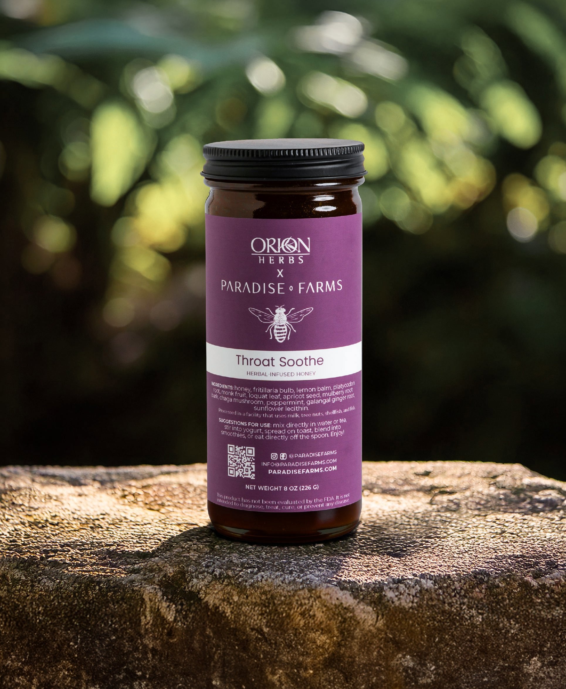 Honey to restore the senses and support seasonal wellness. Our Throat Soothe Herbal-Infused Honey is crafted with a blend of traditional herbs—including fritillary bulb, loquat leaf, chaga, and lemon balm, all grown right here at PF. It's a healing formula made to comfort and uplift. A touch of ginger root and peppermint rounds out the experience, offering a warm, refreshing balance. Stir into hot water, drizzle over toast, or swirl into your favorite smoothie.